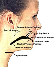 The placement of the tip of the tongue for the tongue stroke should be high on the upper palate, well behind the alveolar ridge. The motion of the tongue should be down and forward so that the tongue rests on the floor of the mouth behind the bottom teeth after the tongue stroke -